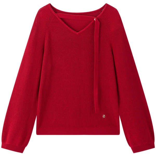 太平鸟红色V领飘带仪式感针织衫
